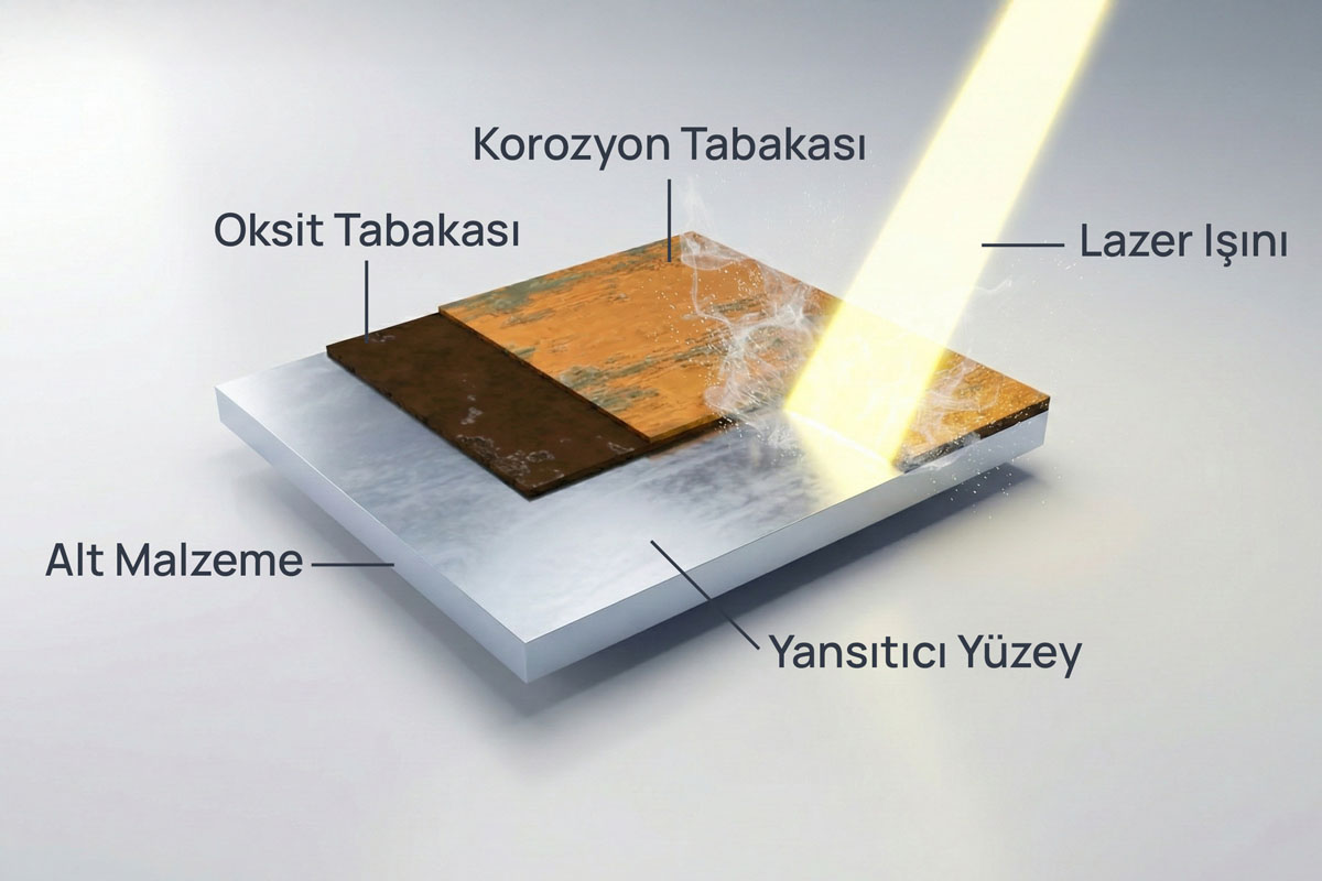 Lazer enerjisini absorbe eden pas, boya ve kaplama katmanları anında buharlaşarak yüzeyden ayrılır. Bu sayede ana malzemede deformasyon, aşınma veya ısıl hasar oluşmaz.